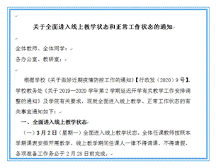 为保障疫情防控期间公司教学工作的顺利开展,按照公司的工作部署和教务处的具体指导和要求,公司结合实际下发了《关于全面进入线上教学状态和正常工作状态的通知》,就网络在线教学等工作做了周密部署。3月2日,经过任课教师精心准备,公司四个本科专业17个教学班如期开课。任课教师将按照本学期教学计划,以线上教学、线上线下混合教学、线上直播等方式开展教学。努力实现“停课不停教、学习不延期”,做好与正式开学后的教学衔接,确保新学期教学计划有序完成。